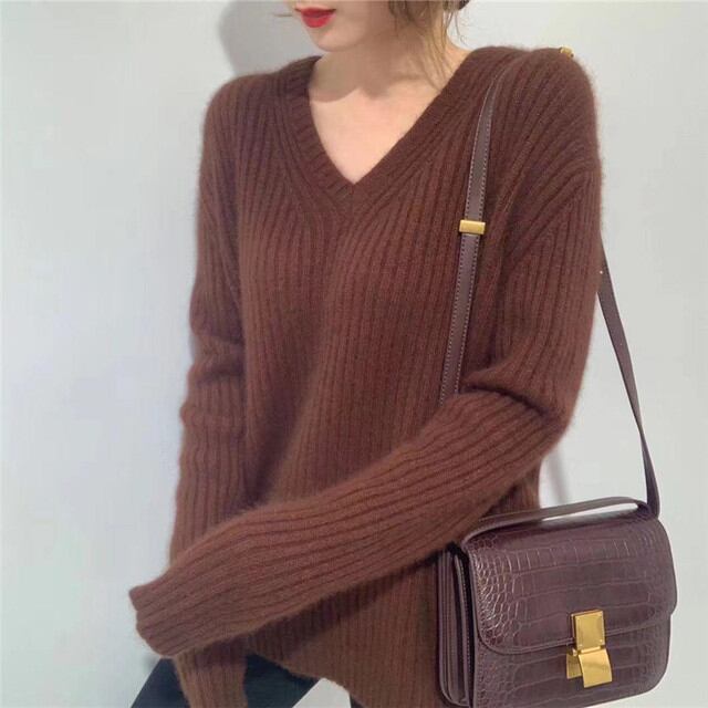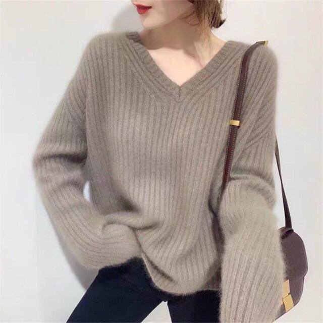 カジュアルな印象ながらもVネックラインでさり気なく上品な大人のゆるふわニットセーターです。