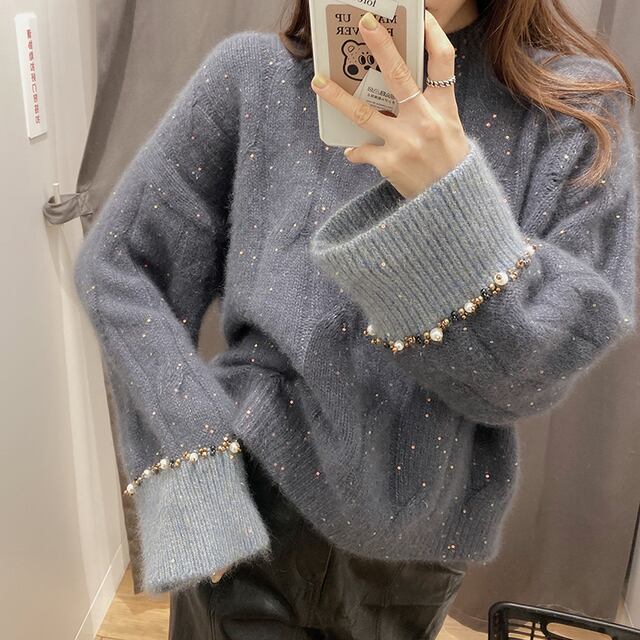 落ち着いた色味ですが華やかさがあるニットセーターです。